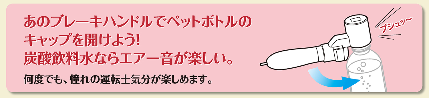 これまでに鉄道会社や鉄道博物館の限定品として人気を博していた「ブレーキハンドル型ボトルキャップオープナー」が、待望の一般発売商品として登場します!ペットボトルの蓋部分に装着し、簡単にキャップを外せる便利グッズ「ブレーキハンドル型ボトルキャップオープナー」は、鉄道ファン・お子さまからの人気だけでなく、握力があまり強くないご年配の方からもご好評をいただいております。電車のブレーキハンドルの形状にそっくりな本製品は、炭酸入り飲料に使用すると「プシューッ!」と実際に電車を運転しているようなサウンドが楽しめます。何度でも、憧れの運転士気分を楽しんじゃおう♪